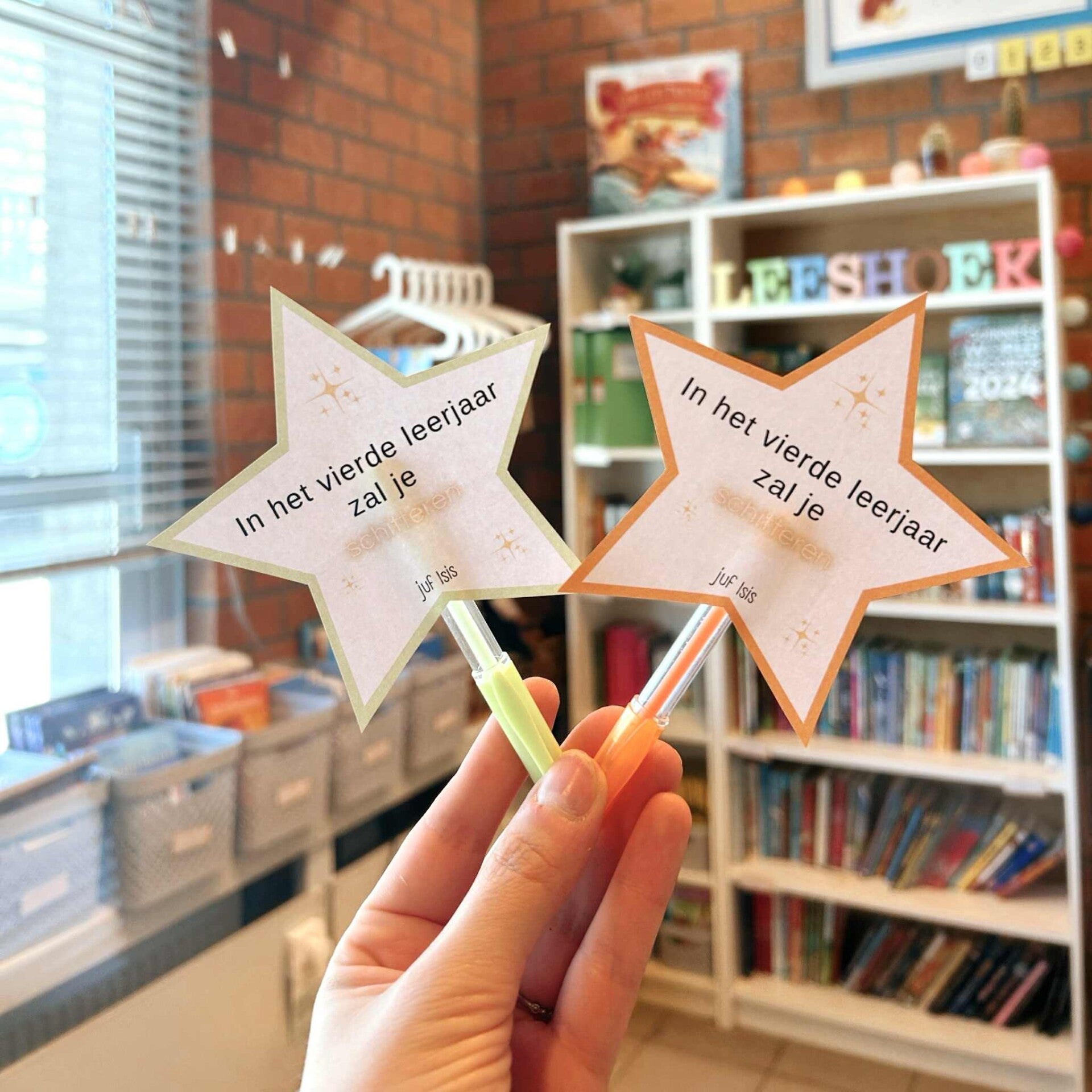 Om de leerlingen welkom te heten in de klas, voorzie ik een klein cadeautje. Je kan het sterretje bevestigen aan een glowstick of een glitterpen.